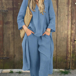 Ten komplet to definicja lekkiej, codziennej elegancji — wygląda jak dopracowana stylizacja, a nosi się jak wygodny set na co dzień. Miękka mieszanka bawełny i lnu pięknie oddycha, a luźniejszy krój z szerokimi „spódnico-spodniami” daje swobodę ruchu i eleganckie układanie materiału.