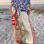 Ten wyjątkowy komplet przyciąga uwagę oryginalnym nadrukiem i swobodnym krojem. Oversize’owa koszula w połączeniu z szerokimi spodniami tworzy modny, nonszalancki look idealny na wakacje, spacery czy letnie wyjścia.