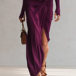 Ta długa sukienka na jedno ramię zachwyca eleganckimi drapowaniami, które podkreślają sylwetkę. Boczne rozcięcie dodaje uwodzicielskiego akcentu bez utraty klasy, a długi rękaw tworzy wyrafinowaną, zbalansowaną całość — idealną na wyjątkowe wieczory.