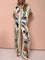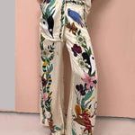 Ten wyjątkowy komplet zachwyca nowoczesnym, artystycznym printem i eleganckim wykończeniem. Koszulowa bluzka zapinana na guziki w połączeniu z luźnymi spodniami tworzy stylowy, a jednocześnie komfortowy zestaw idealny na co dzień i na specjalne okazje.