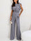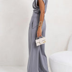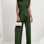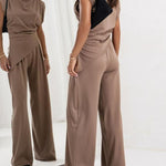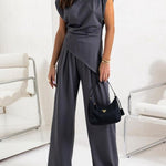 Ten komplet z asymetryczną górą i szerokimi spodniami to definicja nowoczesnej elegancji. Minimalistyczny, ale wyrazisty krój pięknie modeluje sylwetkę i nadaje stylizacji luksusowego charakteru.