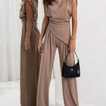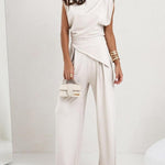 Elegancki komplet z asymetryczną bluzką i szerokimi spodniami