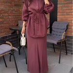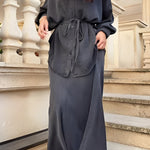 Elegancki komplet z koszulą wiązaną w talii i długą spódnicą