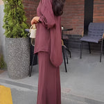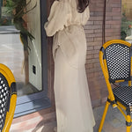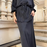 Ten elegancki komplet łączy w sobie minimalizm i kobiecą subtelność. Koszulowa góra z wiązaniem w talii pięknie modeluje sylwetkę, a długa, lejąca spódnica nadaje stylizacji szyku i lekkości. Całość tworzy harmonijny zestaw idealny na wyjątkowe okazje i eleganckie wyjścia.