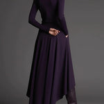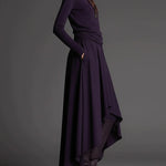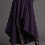 Ten fioletowy komplet z golfem i asymetryczną spódnicą maxi łączy miękką dzianinę z elegancką, artystyczną formą. Swobodny, ale dopracowany krój sprawia, że stylizacja wygląda efektownie bez wysiłku — idealna na co dzień, do pracy i na wyjątkowe wyjścia.