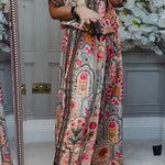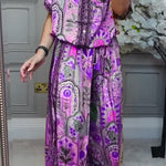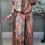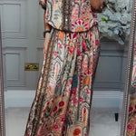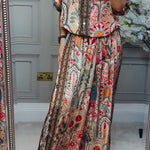 Ten efektowny komplet dwuczęściowy z bogatym, orientalnym printem przyciąga uwagę i podkreśla indywidualny styl. Lekka koszula z krótkim rękawem oraz szerokie spodnie tworzą wygodną, a jednocześnie elegancką stylizację idealną na lato, wakacje i codzienne wyjścia.