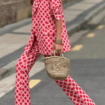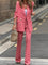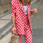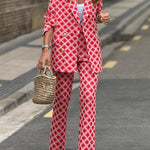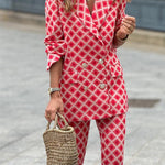 Ten wzorzysty komplet garniturowy w odcieniach różu i czerwieni to propozycja dla kobiet, które lubią przyciągać spojrzenia. Klasyczna marynarka z ozdobnymi guzikami i proste spodnie tworzą elegancką bazę, a geometryczny print dodaje energii i nowoczesnego charakteru.