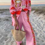 Różowy komplet z motywem morskich stworzeń to lekki, letni zestaw, który łączy wygodę z wyrazistym stylem. Luźna koszula i szerokie spodnie z elastyczną talią tworzą modną, swobodną sylwetkę idealną na wakacje i ciepłe dni.