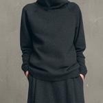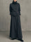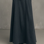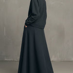 Ten minimalistyczny komplet w odcieniu grafitowej szarości łączy nowoczesną prostotę z subtelną elegancją. Wysoki kołnierz i rozkloszowana spódnica tworzą harmonijną, dopracowaną sylwetkę, która sprawdzi się zarówno na co dzień, jak i w bardziej formalnych stylizacjach.