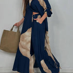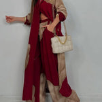 Maxi Minimalistyczna z Bawełny i Lnu z Patchworkiem, Wysoki Kołnierz i Długie Rękawy