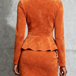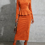 Ten elegancki komplet w ciepłym, pomarańczowy odcieniu podkreśla kobiecą sylwetkę i dodaje stylizacji klasy. Dopasowana bluzka z wysokim kołnierzem oraz efektowną baskinką w połączeniu z ołówkową spódnicą tworzą ponadczasowy, szykowny zestaw idealny do pracy i na wyjątkowe okazje.