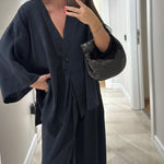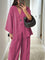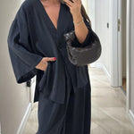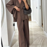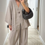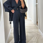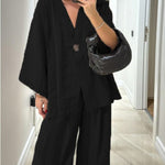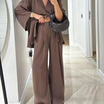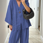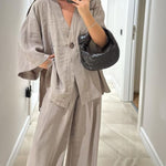 Ten minimalistyczny komplet dwuczęściowy zachwyca prostotą i swobodnym krojem. Lekka narzutka zapinana na guzik w połączeniu z szerokimi spodniami tworzy ponadczasową, wygodną stylizację idealną na co dzień i letnie wyjścia.