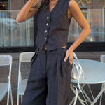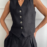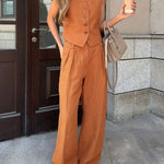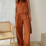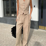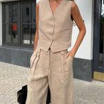 Lniany komplet z kamizelką V-neck i szerokimi spodniami maxi