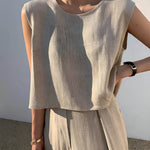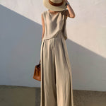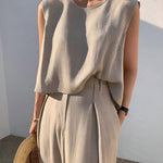 Ten minimalistyczny komplet z luźną bluzką bez rękawów i szerokimi spodniami to kwintesencja nowoczesnej elegancji. Prosty, naturalny krój pięknie układa się na sylwetce i zapewnia pełną swobodę ruchów.