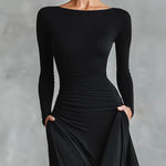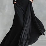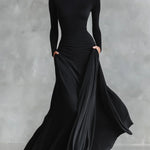 Nowoczesna długa sukienka z czarnego krepu z dekoltem w łódkę i plisami to model stworzony dla kobiet, które chcą wyglądać z klasą i jednocześnie czuć się swobodnie przez cały wieczór. Marszczona góra pięknie pracuje z sylwetką, a lejąca tkanina miękko układa się w ruchu, dając efekt „WOW” bez wysiłku.