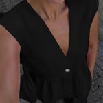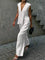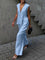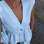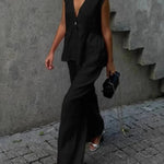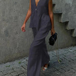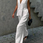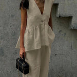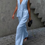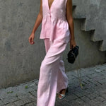 Pudrowy lniano-bawełniany komplet z kamizelką V-neck i luźnymi spodniami