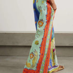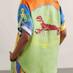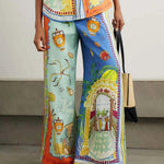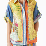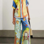 Ten wyjątkowy komplet dwuczęściowy zachwyca energetyczną kolorystyką i artystycznym, wakacyjnym printem inspirowanym motywami śródziemnomorskimi. Luźna koszula z kołnierzykiem w połączeniu z dopasowanymi stylistycznie spodniami tworzy odważną, modową stylizację idealną na lato.