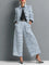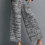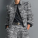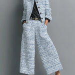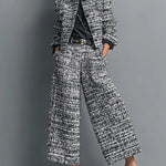Tweedowy zestaw z krótką marynarką i szerokimi spodniami z wysokim stanem